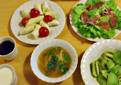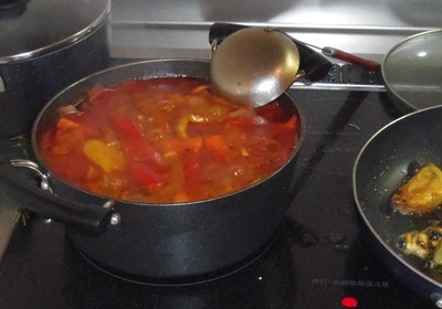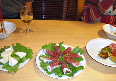 アサリ、オリーブオイル、調味料を除きハーブなど、ほとんど地元の食材 を用いた即席イタリアン。チーズ、柿とアボガドの生ハム巻き、ベーコンと ジャガイモのニンニク炒め、アサリのワイン蒸し、メインはビーフのトマト煮。