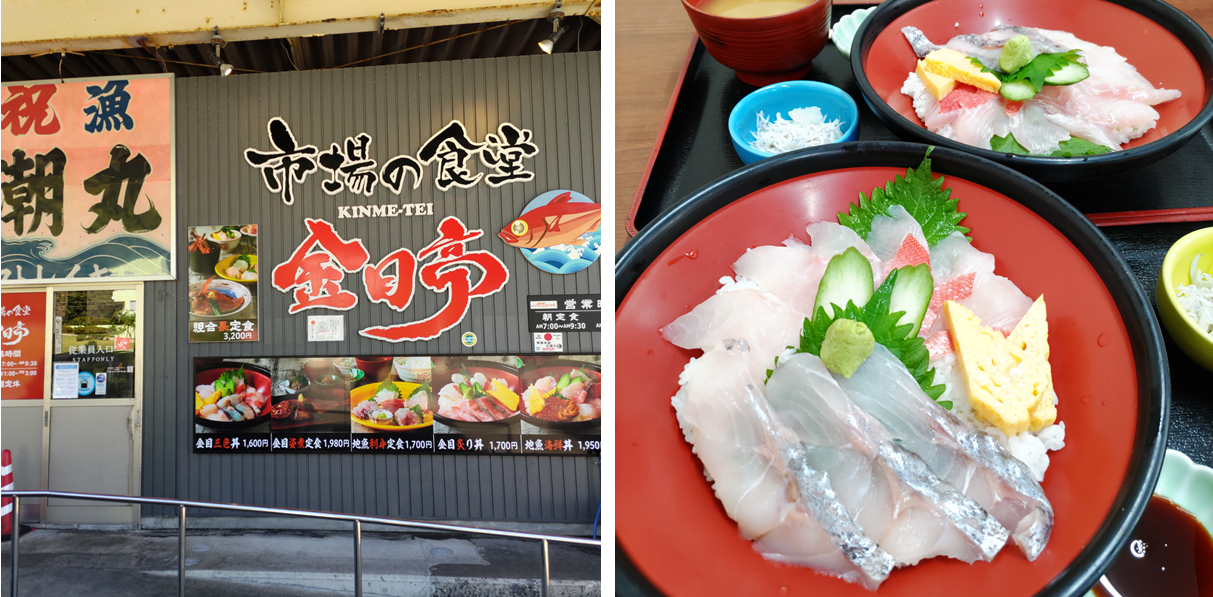 下田港魚市場直結の㊧金目亭、㊨金目三色丼